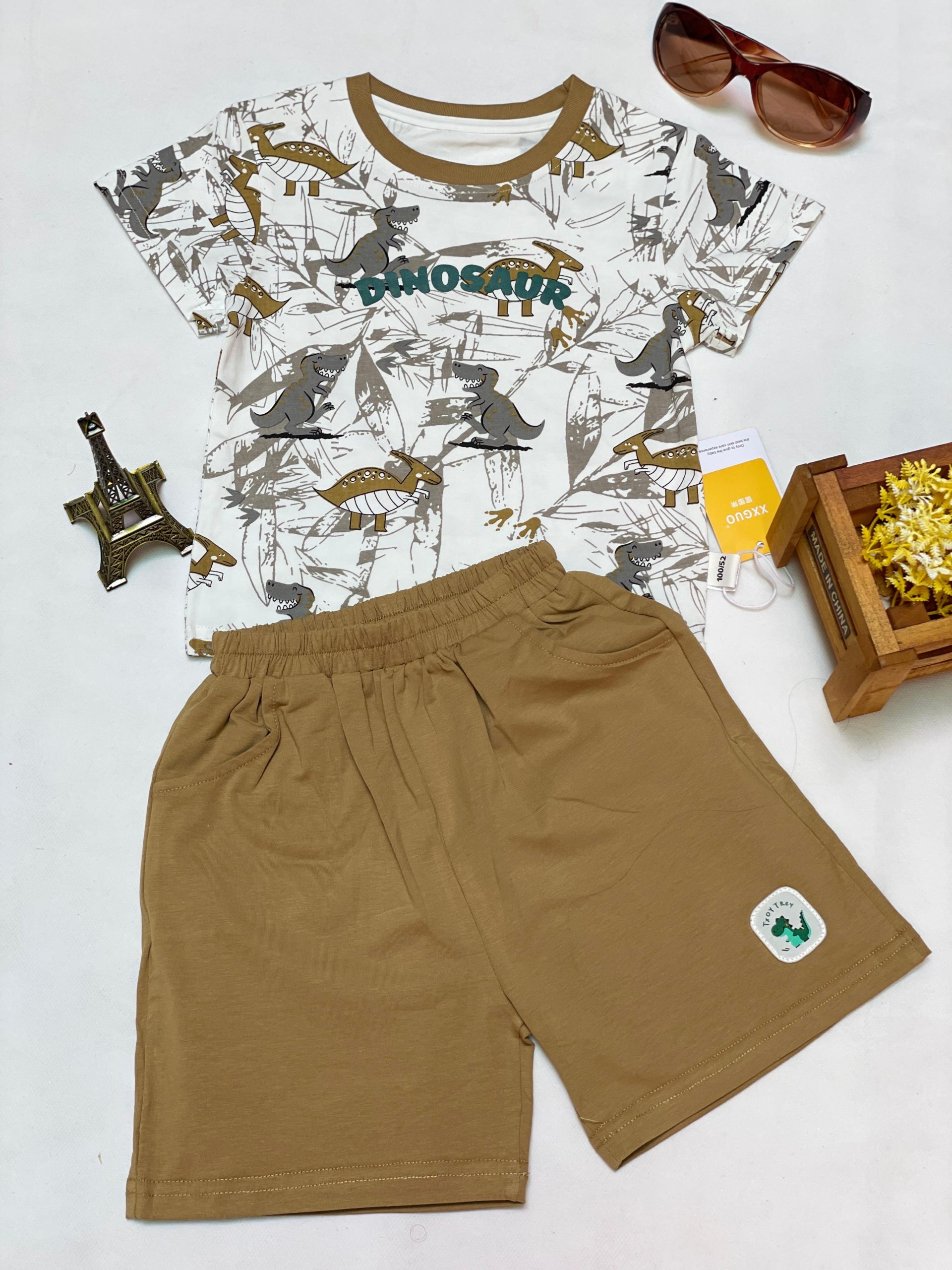 Let your little one roar in style with this beige dinosaur print outfit! Featuring a fun prehistoric design, this soft cotton t-shirt and comfy matching shorts are ideal for warm weather play and adventure.