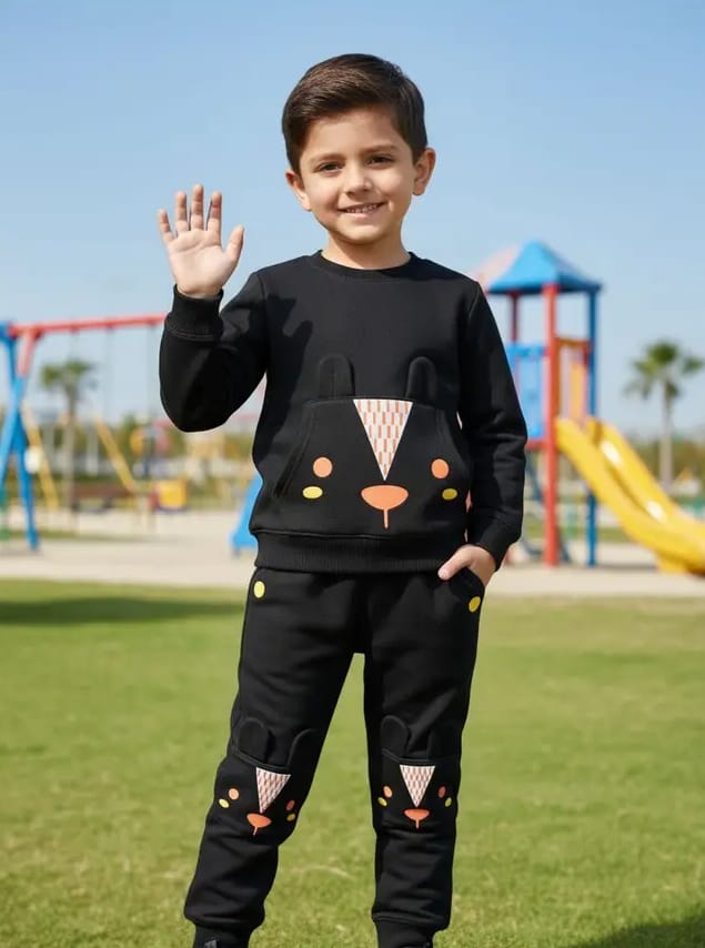 Trendy black kids’ tracksuit with adorable print design. Perfect for playtime, casual wear, and outings – soft, comfy, and stylish!