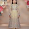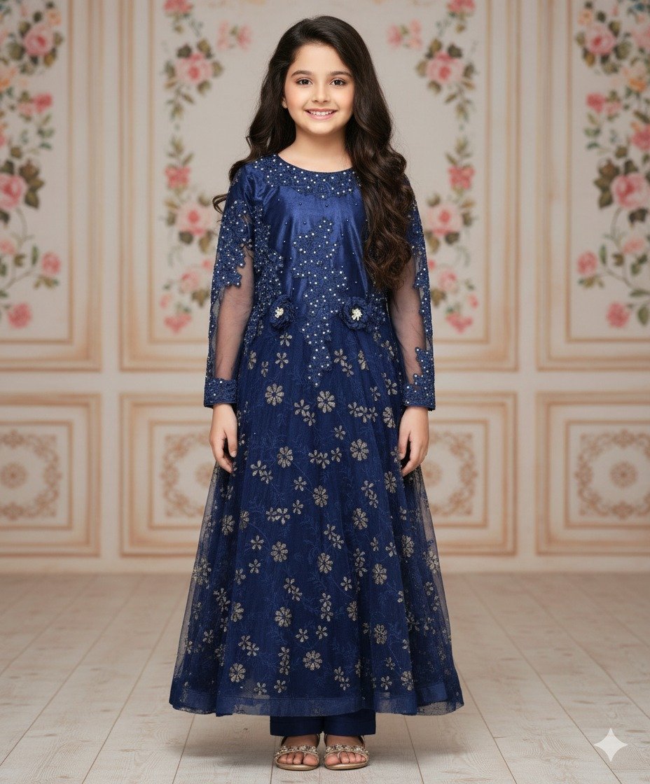 A breathtaking Sapphire blue three-piece traditional ensemble for girls, perfect for parties, formal events, Eid, or weddings. This elegant Anarkali features a beautifully embellished bodice with delicate beads and 3D floral accents, flowing into a net flared skirt adorned with sparkling floral motifs. Paired with sheer full sleeves and comfortable slim trousers, this outfit offers a truly regal and enchanting look.