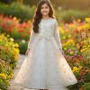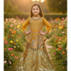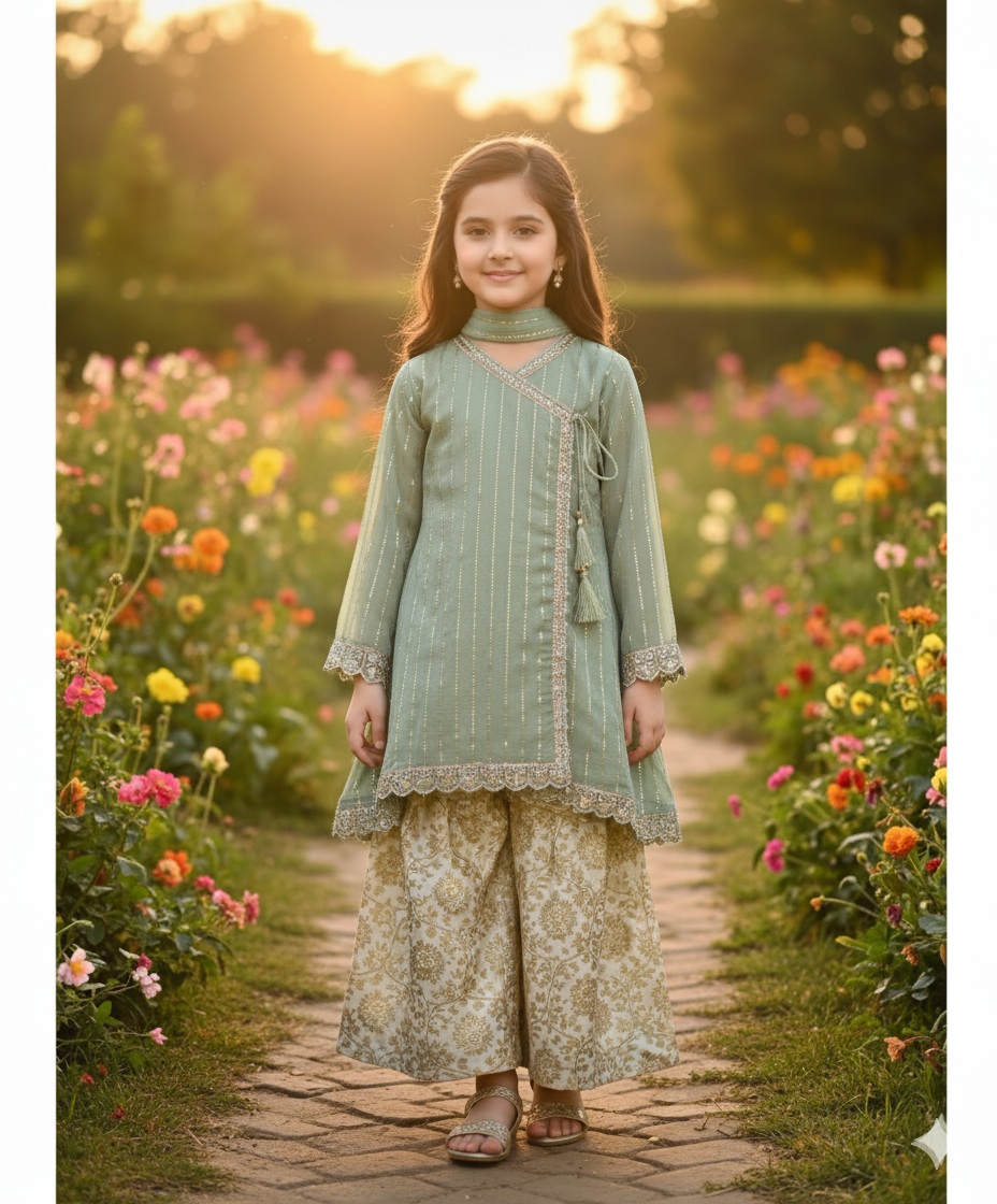 A charming Pistachio green two-piece traditional ensemble for girls, perfect for Eid, casual gatherings, or festive daytime events. This elegant set features a classic Angrakha-style top adorned with delicate sequin lines and intricate lace detailing on the cuffs and hem. It is perfectly paired with wide-leg palazzo trousers featuring a subtle gold print. A matching choker completes this graceful and comfortable outfit.