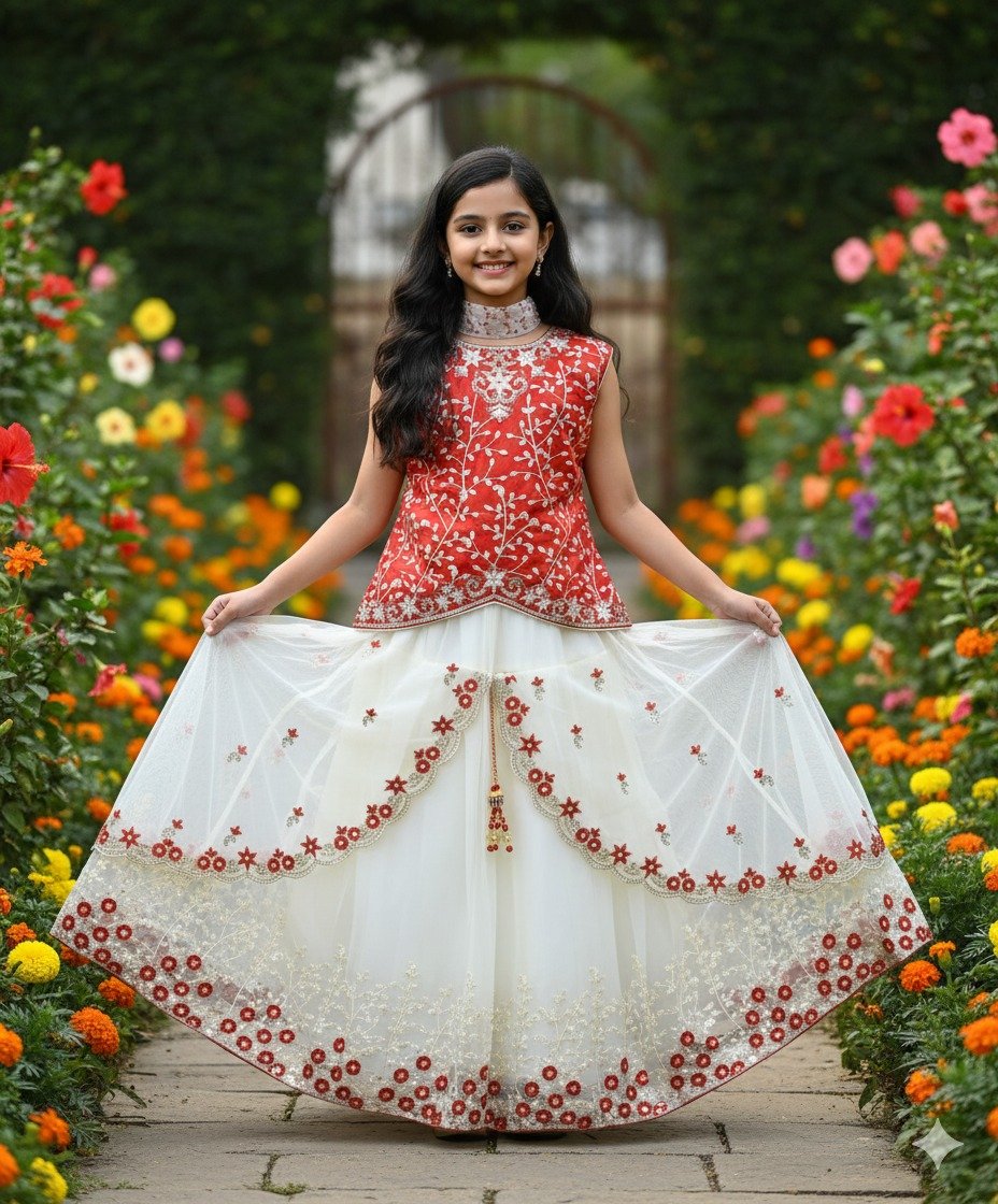An enchanting ensemble featuring a vibrant red embroidered peplum top and a flowing white skirt with intricate floral detailing, perfect for special occasions.