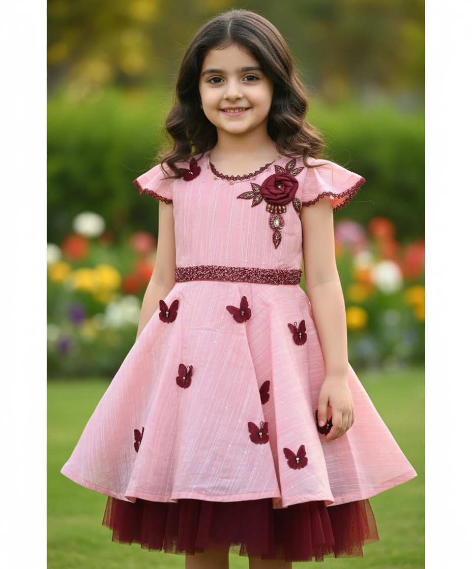 This adorable pink dress features charming butterfly appliques, a richly embroidered bodice with a beautiful floral detail, and delicate lace trim on the sleeves. Perfect for your little one, this sweet and playful outfit is ideal for parties, special occasions, or simply adding a touch of whimsy to everyday wear.