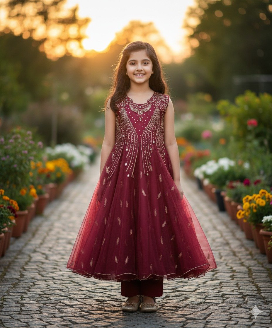 A magnificent Burgundy maroon sleeveless gown for girls, perfect for weddings, formal parties, Eid celebrations, or special occasions. This captivating Anarkali features a heavily embellished bodice with intricate gold Zari embroidery and shimmering details. Its flowing net skirt is adorned with delicate motifs, and it’s completed with matching slim trousers (peeking out), creating a truly opulent and radiant look.