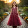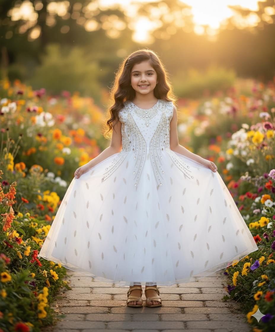 A pristine White sleeveless gown for girls, perfect for weddings, parties, birthdays, or special occasions. This ethereal dress features a beautifully embellished bodice with shimmering gold and silver embroidery and scattered feather motifs. Its flowing net skirt adds a graceful touch.