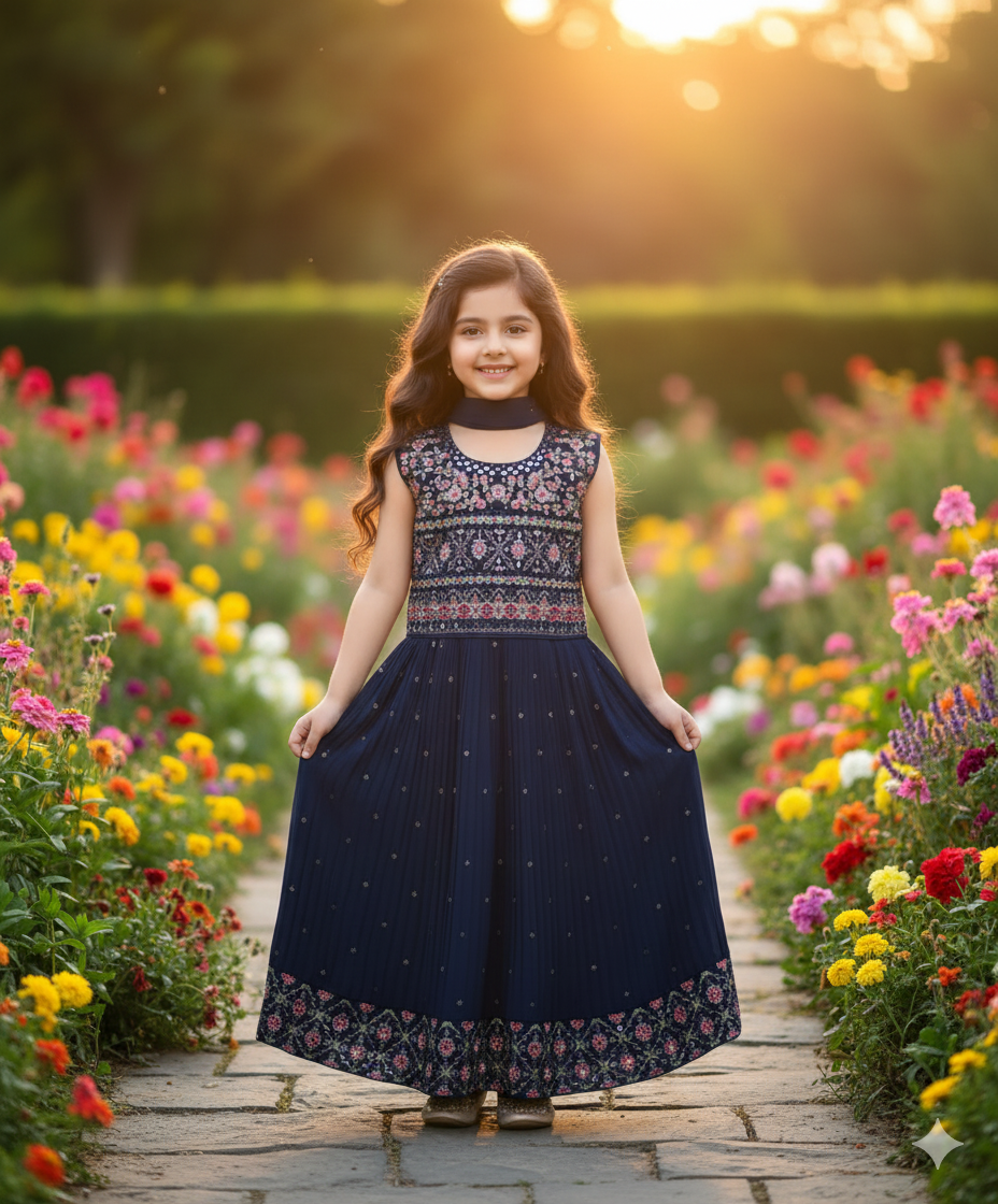 A captivating Midnight blue sleeveless gown for girls, perfect for parties, festive celebrations, or special occasions. This elegant dress features a richly embroidered bodice with vibrant floral patterns in pink and green, leading to a gracefully pleated skirt adorned with matching floral borders. Its deep blue hue and intricate detailing create a truly enchanting and sophisticated look.