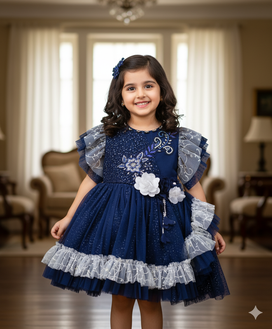 This stunning navy blue dress, adorned with delicate lace, shimmering sequins, and elegant floral appliques, is perfect for your little princess. Featuring a comfortable fit and exquisite detailing, it’s ideal for parties, special occasions, or making everyday moments magical.