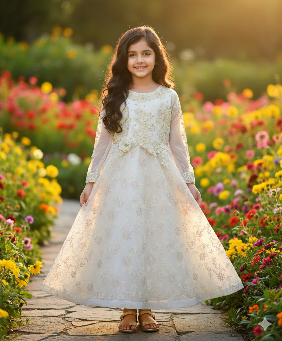 A breathtaking Ivory formal gown for girls, perfect for weddings, Nikkah ceremonies, engagements, or grand parties. This exquisite full-length dress features intricate floral embroidery and delicate beadwork throughout its flowing skirt and illusion-sleeve bodice. A charming rosette detail at the waist adds a touch of grace. Its timeless design and subtle sparkle ensure a truly enchanting look.