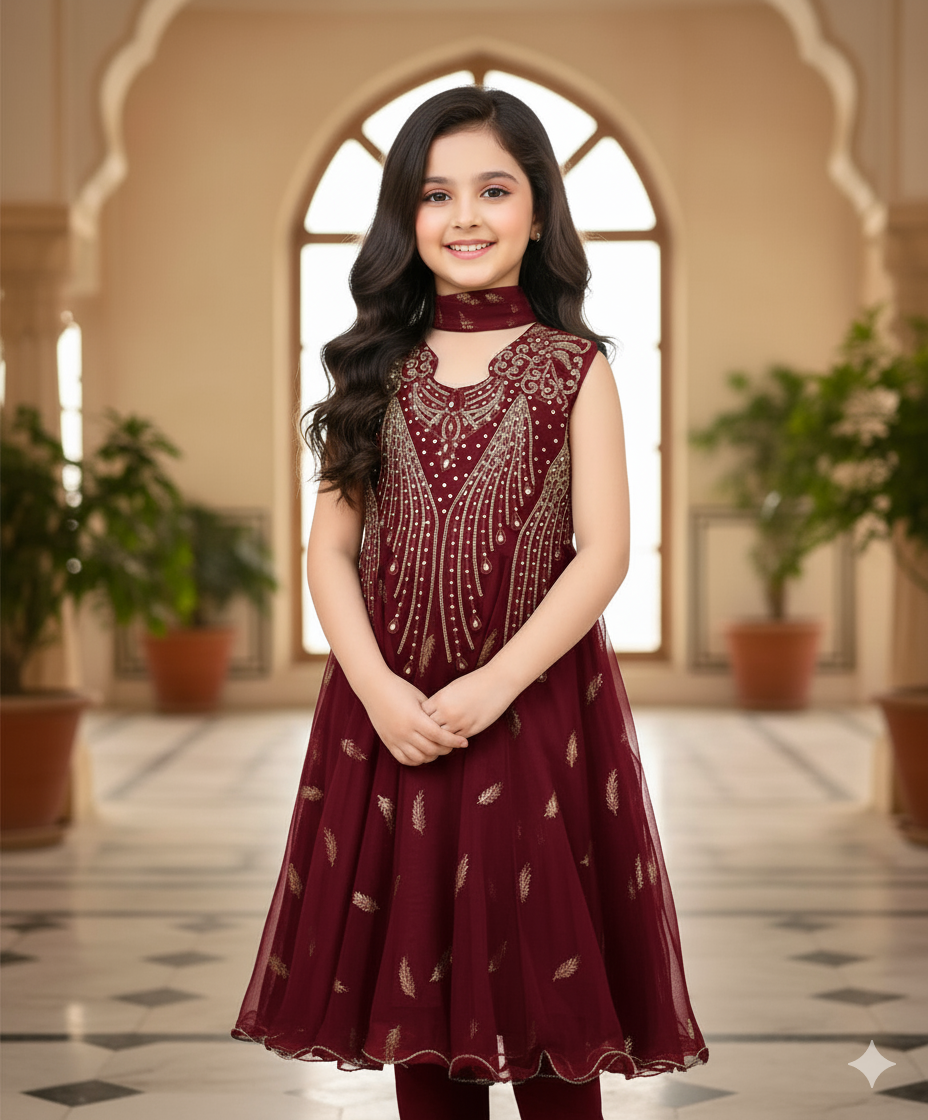 This striking maroon ensemble showcases a richly embroidered bodice with ornate gold patterns, reminiscent of elegant wings, and a gracefully flared tunic detailed with shimmering gold leaf motifs. Complete with matching trousers and a stylish choker, this outfit is ideal for festive occasions, weddings, or ensuring your little one makes a truly majestic statement.