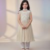 This stunning traditional ensemble features a richly embroidered sleeveless red top adorned with colorful floral and geometric patterns, paired with a flowing, off-white skirt embellished with delicate multi-colored motifs. Complete with a matching small purse, this vibrant outfit is perfect for festive celebrations, cultural events, or adding a touch of lively charm to your little one’s special occasions.