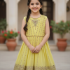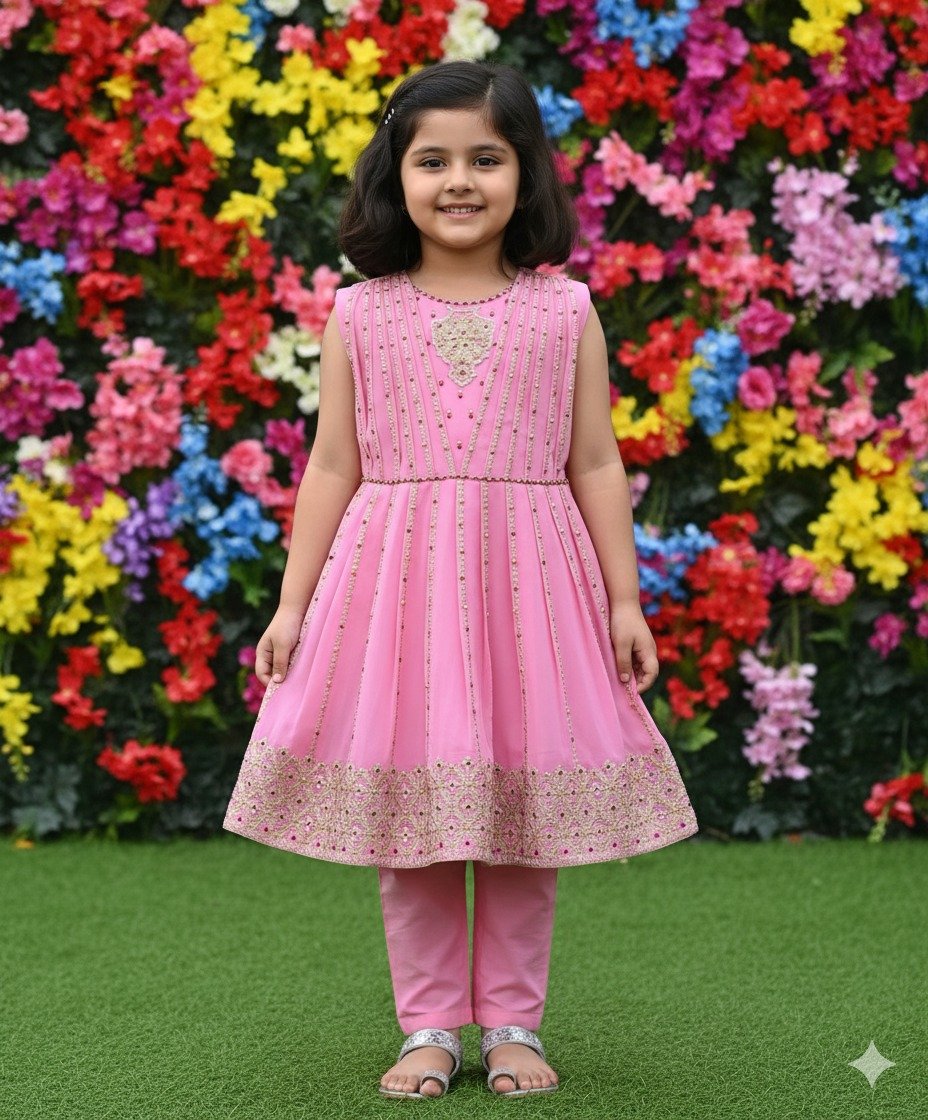 This adorable pink sleeveless tunic is adorned with intricate golden embroidery on the bodice and a rich, embellished border, complemented by matching pink trousers. Ideal for lively parties, festive gatherings, or making a cheerful statement against a vibrant floral backdrop, ensuring your little one shines.