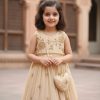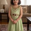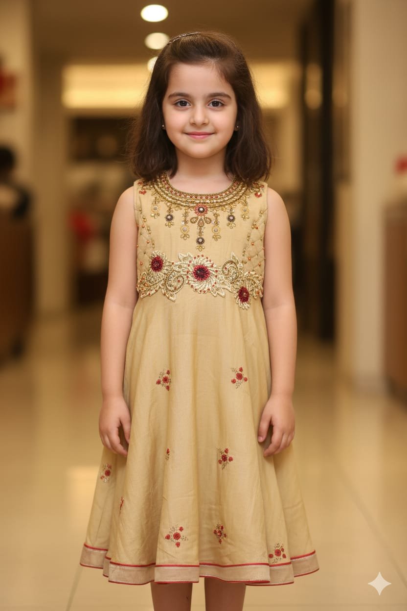 A beautiful girls’ traditional dress featuring stunning gold and ruby-toned embroidery. The sleeveless dress has intricate mirror-like beadwork on the yoke, with elegant floral patterns flowing down the skirt. This festive party outfit is perfect for weddings, traditional ceremonies, and special occasions.
