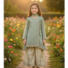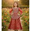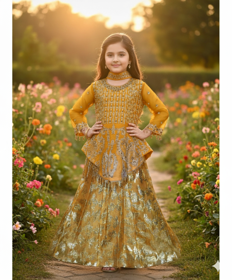 A radiant Marigold yellow three-piece traditional ensemble for girls, perfect for Mayoun, Mehndi, weddings, or grand festive occasions. This spectacular outfit features a richly embellished top with intricate gold embroidery and Gota work on a peplum-style bodice. It is paired with a matching full-flared Farshi skirt with a shimmering foil print, and complementing full sleeves with tassels. A matching choker completes this opulent look.