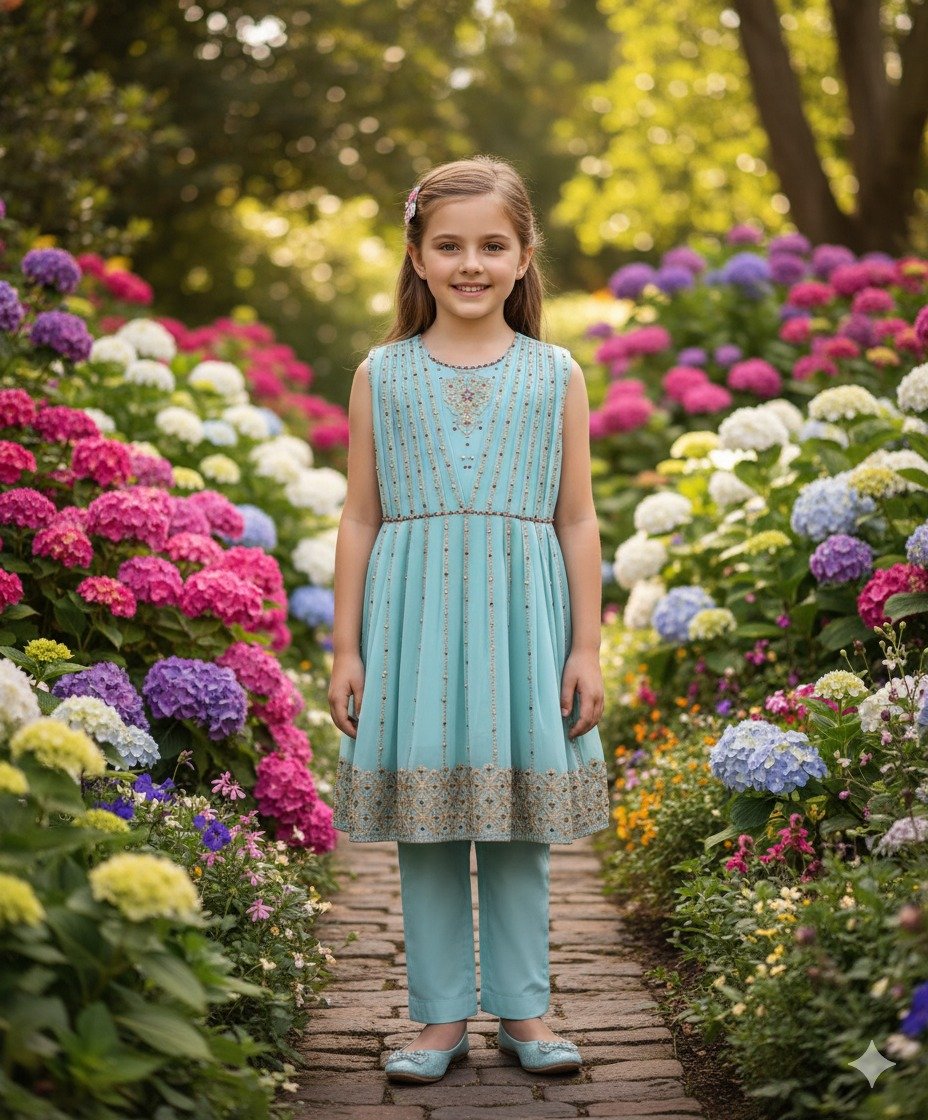 This delightful aqua blue sleeveless tunic features elegant vertical embellishments and a beautifully embroidered hem, paired with comfortable matching trousers. Perfect for garden strolls, outdoor celebrations, or adding a fresh, charming touch to your little one’s wardrobe amidst blooming flowers.