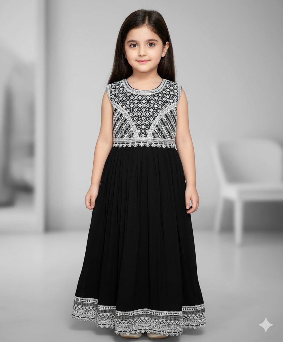 A timeless black and white sleeveless frock for girls, perfect for casual outings, parties, or festive celebrations. This elegant dress features a captivating geometric pattern and intricate embroidery on the bodice and hemline, creating a classic Monochrome look. Its comfortable, flared silhouette ensures both style and ease of movement.