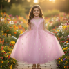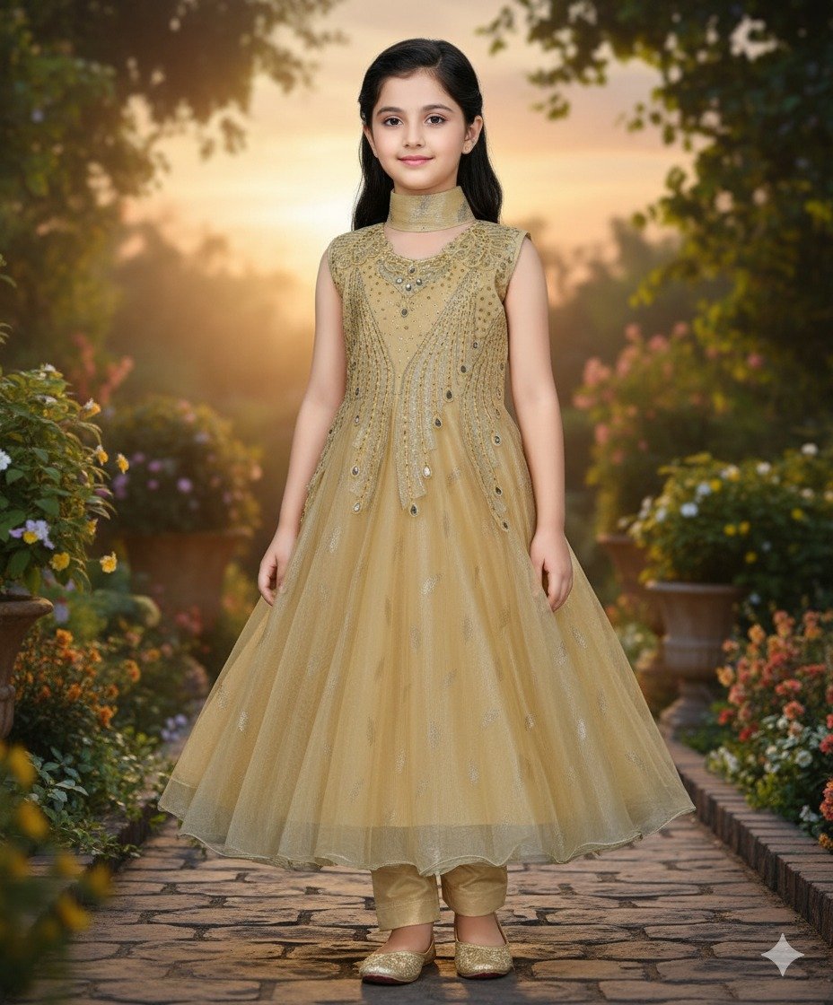 An exquisite Nougat gold-beige three-piece ensemble for girls, perfect for weddings, formal parties, Eid celebrations, or special occasions. This captivating sleeveless gown features a beautifully embellished bodice with intricate gold and silver embroidery and shimmering beadwork. Its flowing net skirt is complemented by matching slim trousers and a coordinating choker, creating a truly sophisticated and radiant look.
