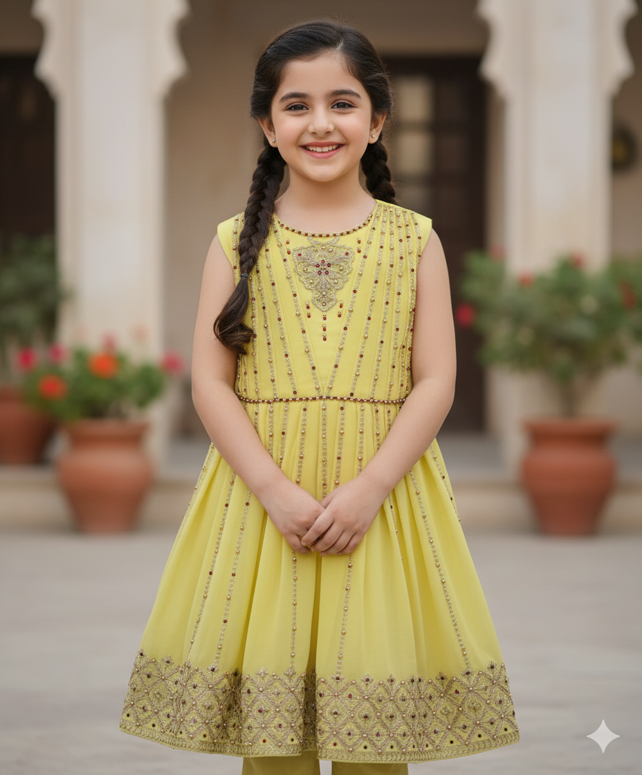 Dazzling yellow formal dress for girls, featuring intricate beadwork and embroidery, perfect for festive occasions and celebrations.