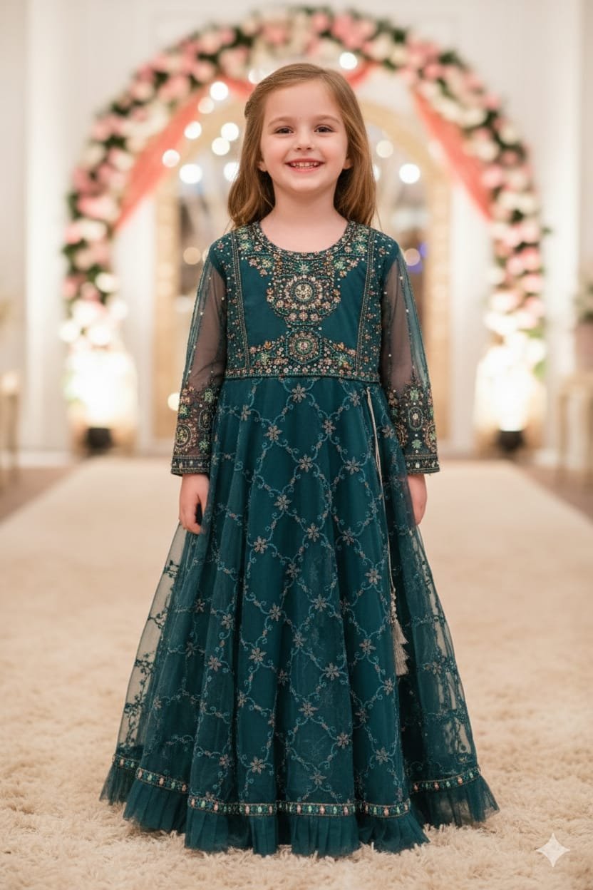 A magnificent girls’ full-length gown in a deep teal/peacock shade. This luxurious long sleeve dress features a heavily embroidered yoke and neckline, with the sheer net skirt detailed in delicate diamond patterns. The perfect formal gown for wedding receptions, gala events, and festive gatherings.