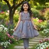 This enchanting pink sleeveless frock showcases a vibrant embroidered bodice and a whimsical skirt with delicate floral and geometric patterns. Accompanied by matching pink trousers, this graceful outfit is ideal for celebrations, family gatherings, or adding a touch of majestic charm to your little one’s special moments against a grand backdrop.