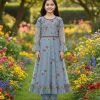 A radiant Red sleeveless traditional ensemble for girls, featuring a flowy Kalidar-style frock and matching trousers. The bodice and border are adorned with exquisite silver embroidery in a geometric pattern, making it ideal for festive events, weddings, or grand parties. This vibrant Crimson outfit ensures a captivating and comfortable look for your little one.
