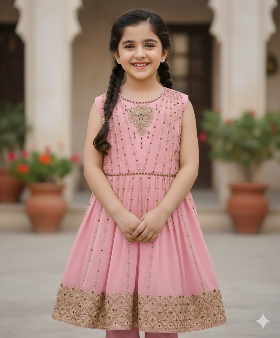 Charming pink formal dress for girls, adorned with delicate beadwork and elegant embroidery, perfect for special occasions and festivities.