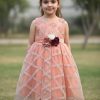 A beautiful girls’ traditional Angrakha dress in a rich rust orange. It features a classic wrapped bodice in intricate brocade fabric and full sheer sleeves with tassel detailing. The tiered skirt adds volume, making this full sleeve festive dress perfect for fall weddings, Diwali, and formal winter celebrations.