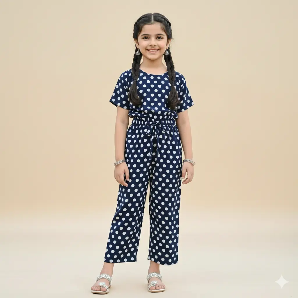 This enchanting ensemble features classic white polka dots on a beautiful blue canvas, creating a charming and timeless look. Crafted for comfort and designed to make a statement, this jumpsuit is the perfect choice for a chic and joyful wardrobe.